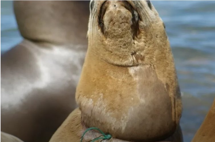 Con lo que aparenta ser un tramo de soga o red de pesca en su cuello.