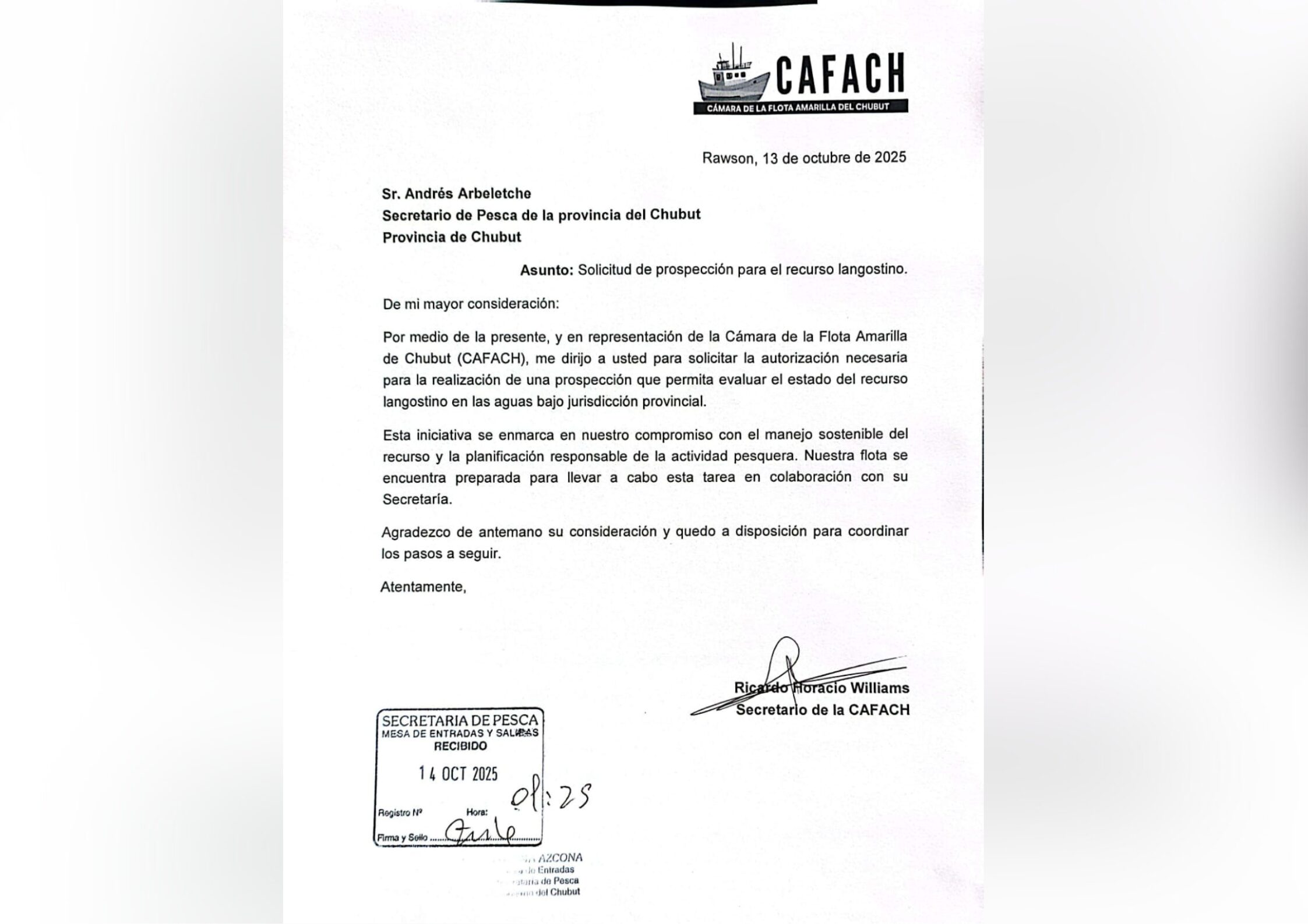 La Cámara de la Flota Amarilla de Chubut (CAFACH) presentó formalmente ante la Secretaría de Pesca de la Provincia la solicitud para dar inicio a la prospección de langostino en aguas de jurisdicción provincial durante los últimos días de octubre, con el objetivo de habilitar el comienzo de la temporada a inicios de noviembre.