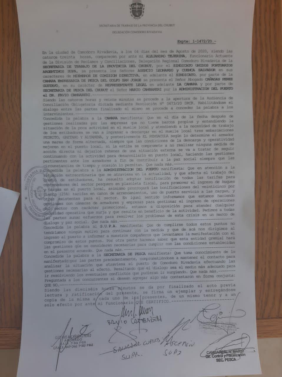 Se firmó el acuerdo entre la Cámara Empresaria de Pesca del Golfo San Jorge y SUPA, en el cual pactaron el levantamiento de las medidas de fuerza, que se venia desarrollando desde el día de ayer.