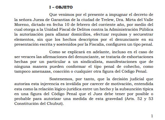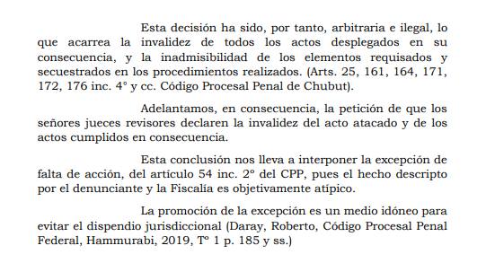 Invalidez de los allanamientos: Impugnan el decreto de la jueza de Garantías de Trelew, Dra. Mirta del Valle Moreno, que autorizó allanamientos, requisas y secuestros el pasado 10 de febrero. Sostienen que la decisión es «arbitraria e ilegal» por carecer de motivación lógica-jurídica.
