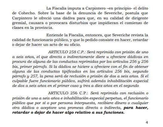 La controversia judicial se desató tras la denuncia de Severiche, quien sostuvo que Carpintero —en su rol de asesor de la CaFACH— le habría ofrecido una dádiva para que, como dirigente gremial, provocara disturbios que impidieran el normal inicio del ciclo lectivo en la provincia. Sobre esta base, la Fiscalía imputó a Carpintero el delito de cohecho.