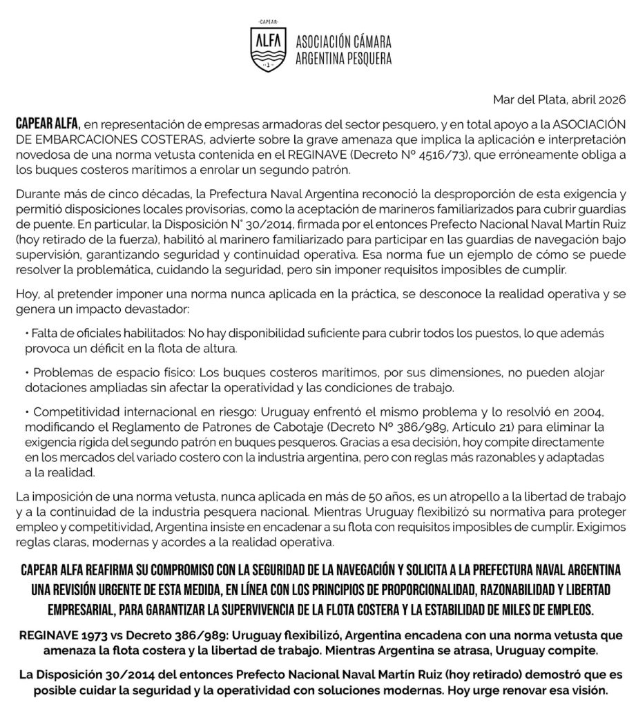 La obligatoriedad de embarcar un segundo patrón en la flota costera ha generado un fuerte rechazo en el sector pesquero. A través de un comunicado, CAPEAR ALFA respaldó el reclamo de la Asociación de Embarcaciones Costeras, advirtiendo que la aplicación rígida del REGINAVE (Decreto Nro. 4516/73) pone en riesgo la operatividad de los buques y el sostenimiento del empleo en el sector fresquero.
