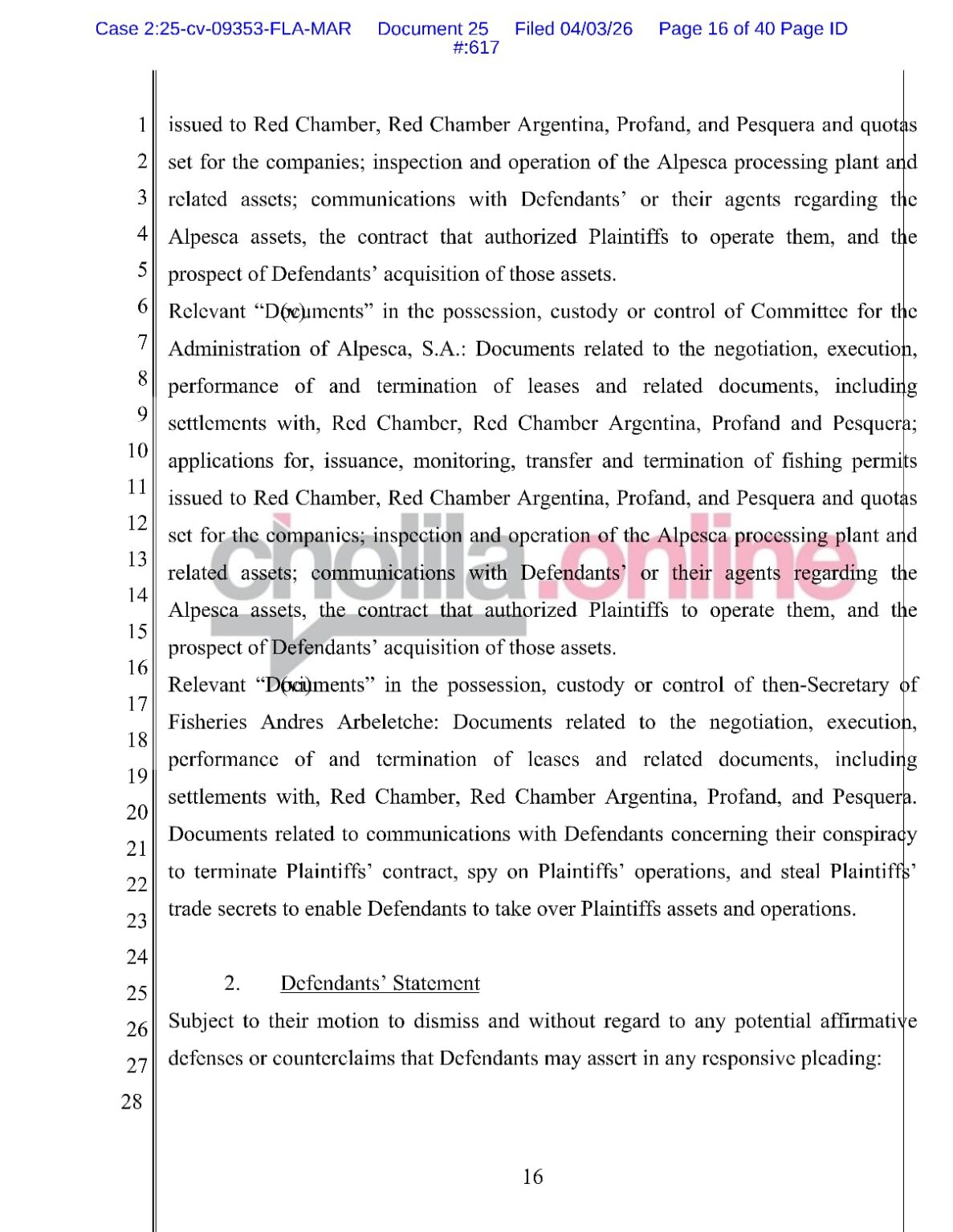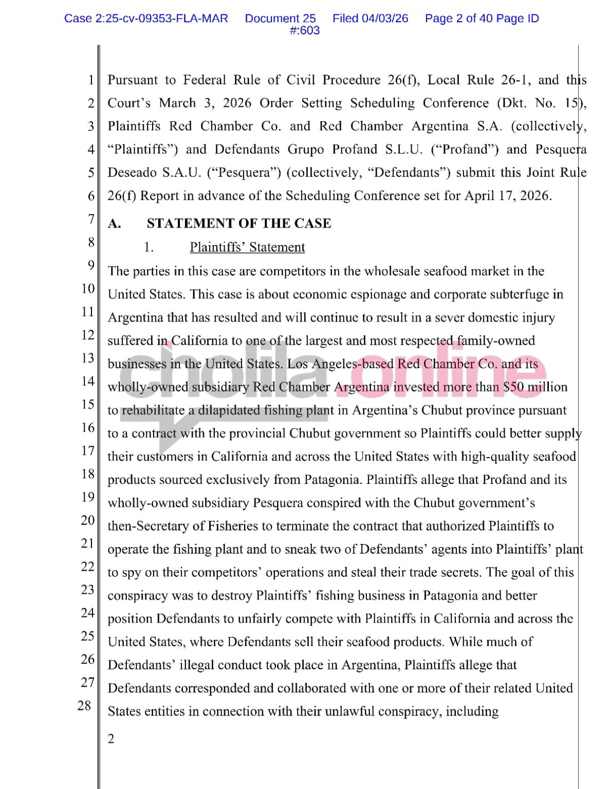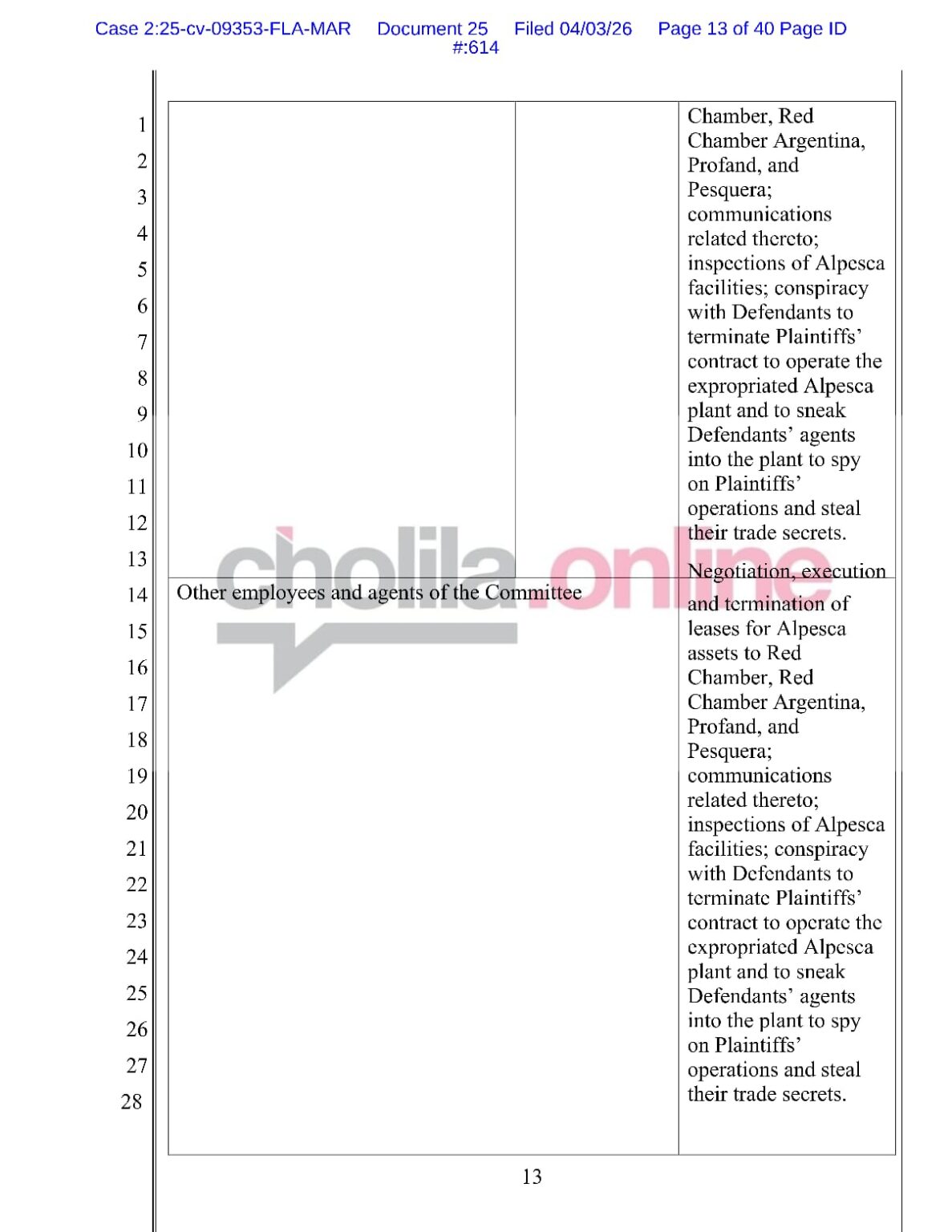 Según el reporte conjunto presentado ante el Juez Fernando L. Aenlle-Rocha, Red Chamber Argentina alega haber sido víctima de una maniobra orquestada entre el Gobierno del Chubut y el holding español Grupo Profand. La demanda sostiene que el entonces Secretario de Pesca de la provincia —identificado en el documento como el Dr. Andrés Arbeletche— habría conspirado para finalizar de forma abrupta el contrato que permitía a Red Chamber operar la planta expropiada de Alpesca.