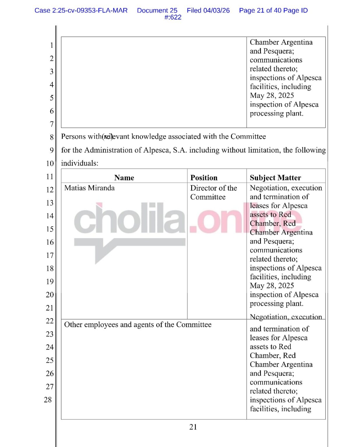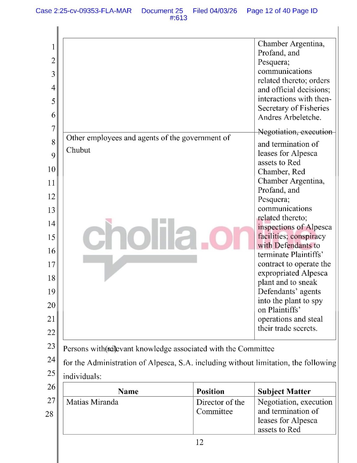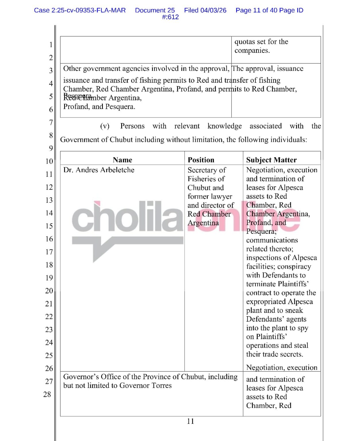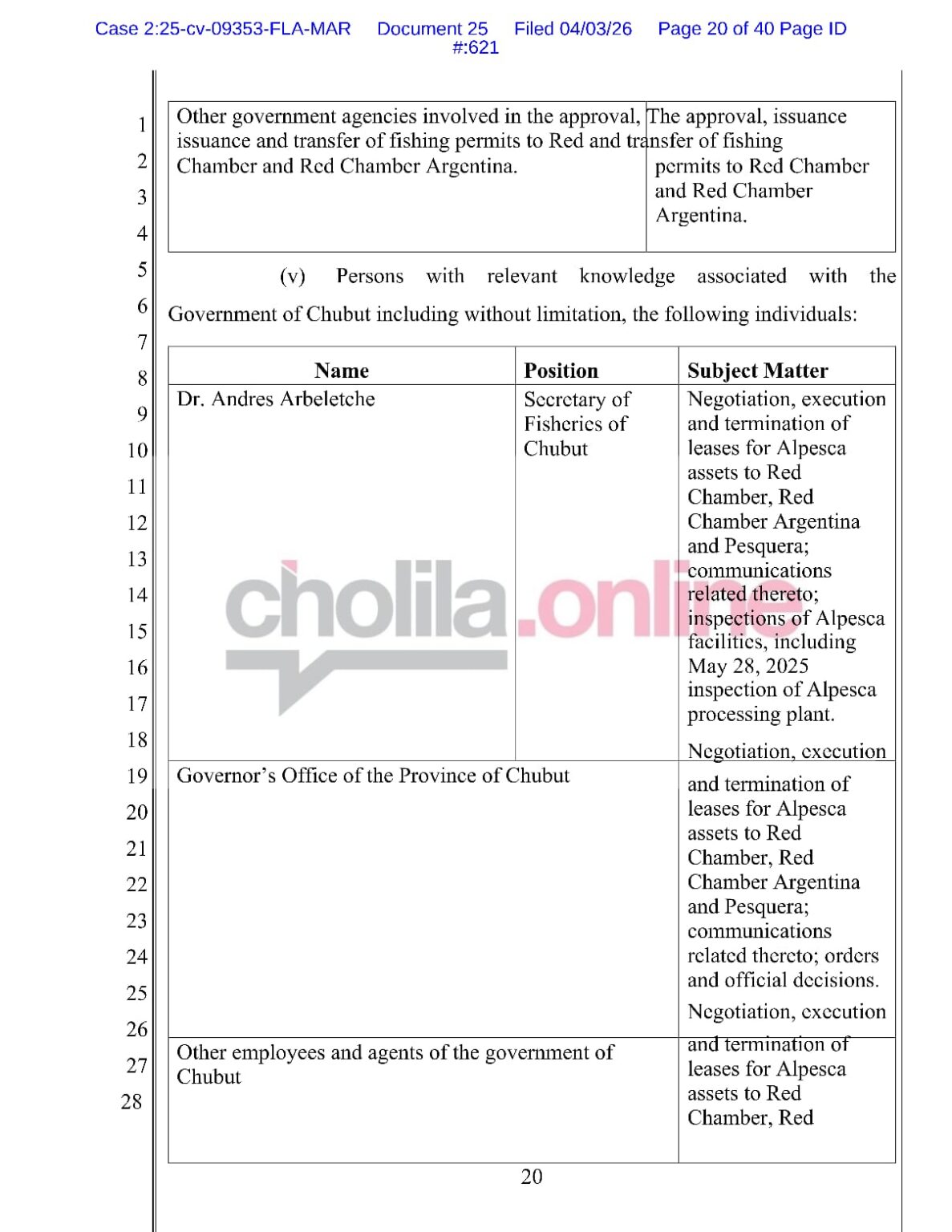 La justicia estadounidense no solo pone el foco en los mandos medios. La demanda incluye entre las personas con conocimiento relevante de estos hechos a la propia Oficina del Gobernador, mencionando explícitamente a Ignacio Torres en relación con las decisiones oficiales, comunicaciones y órdenes que derivaron en la terminación del contrato con Red Chamber para beneficiar supuestamente a Profand y Pesquera Deseado.