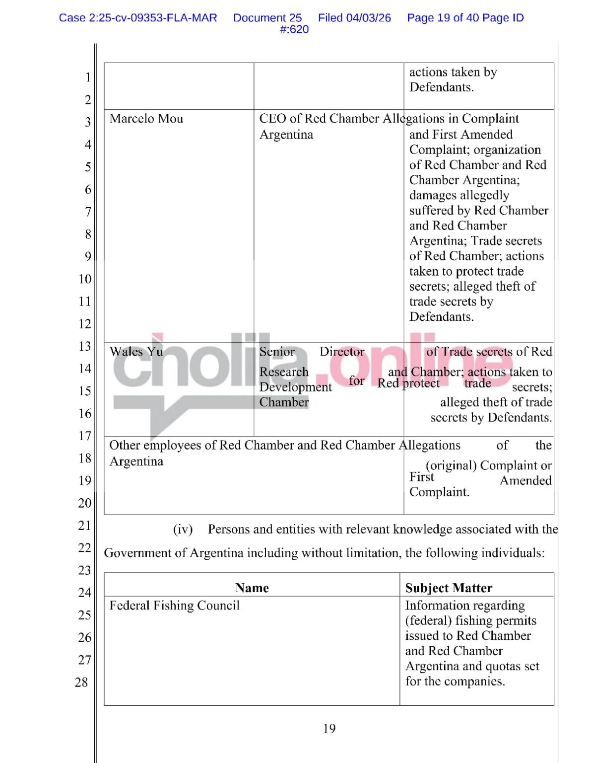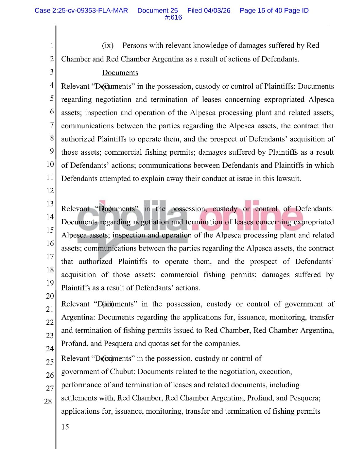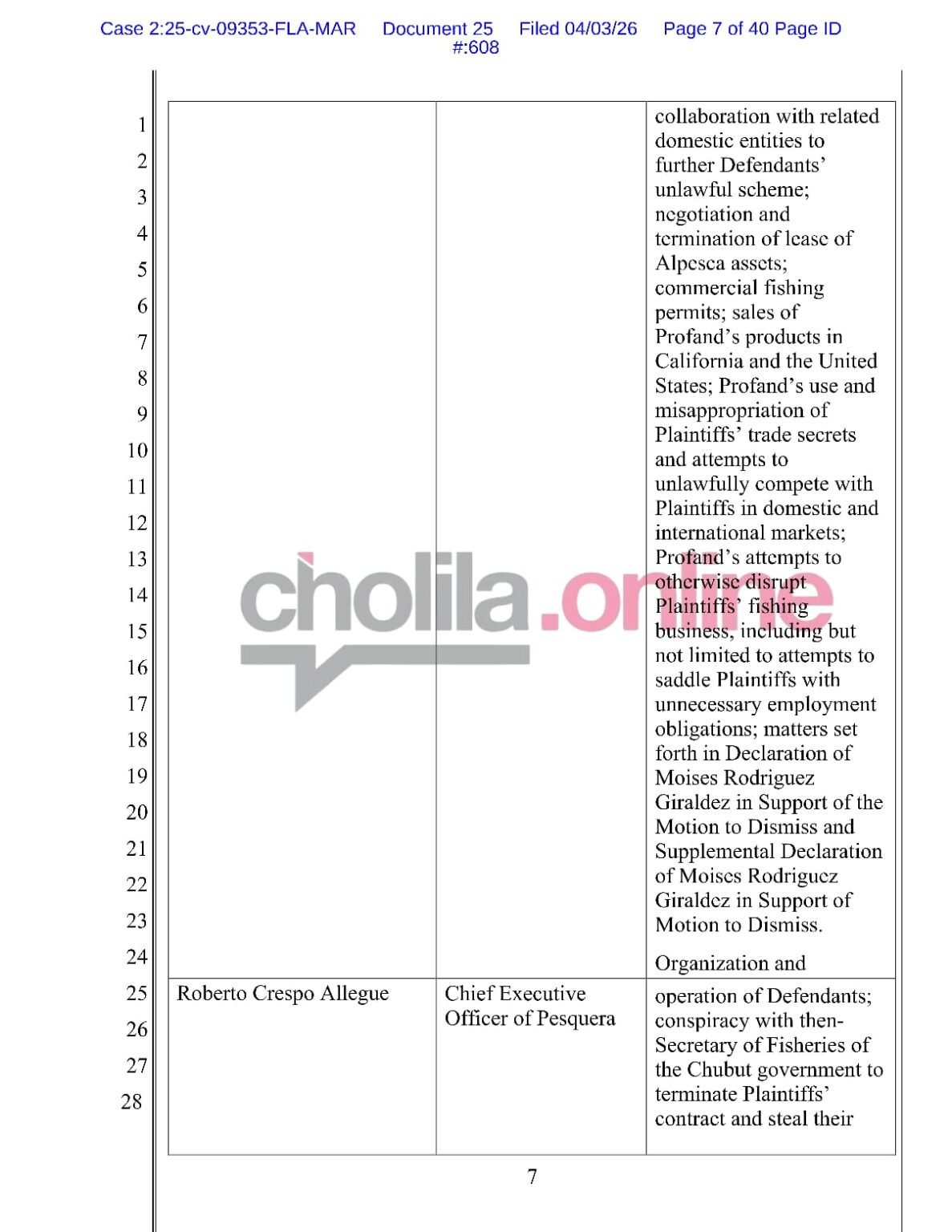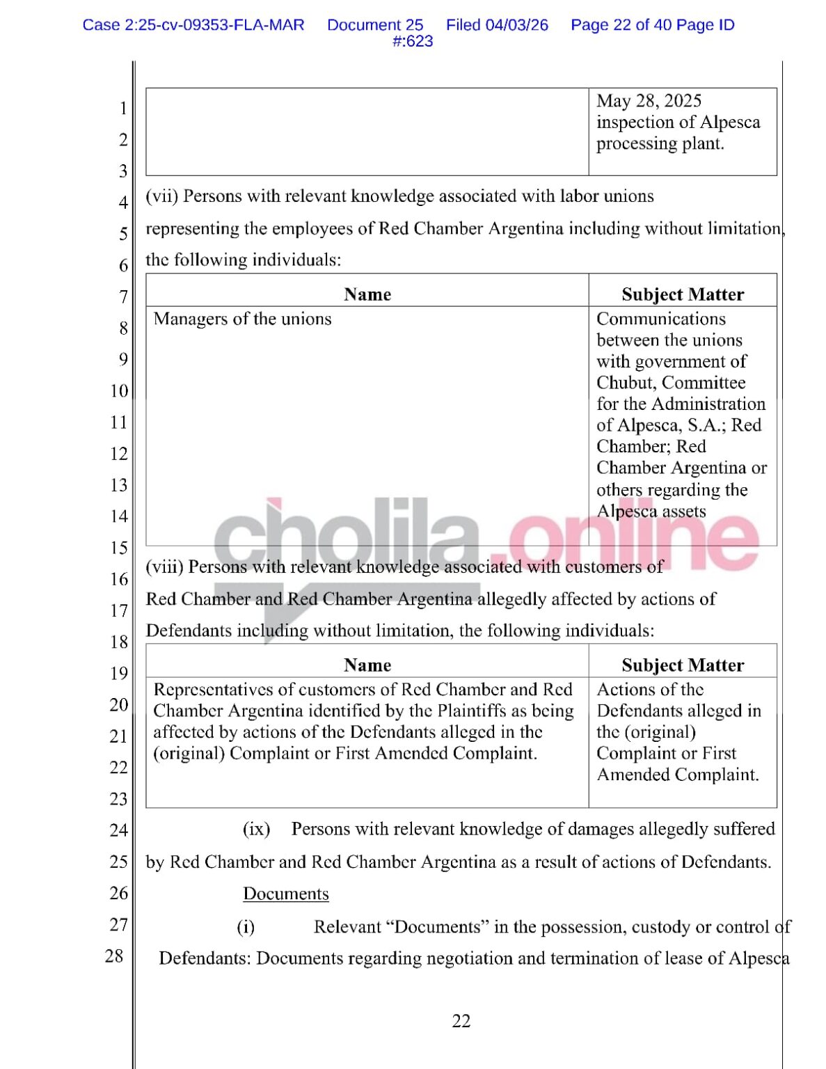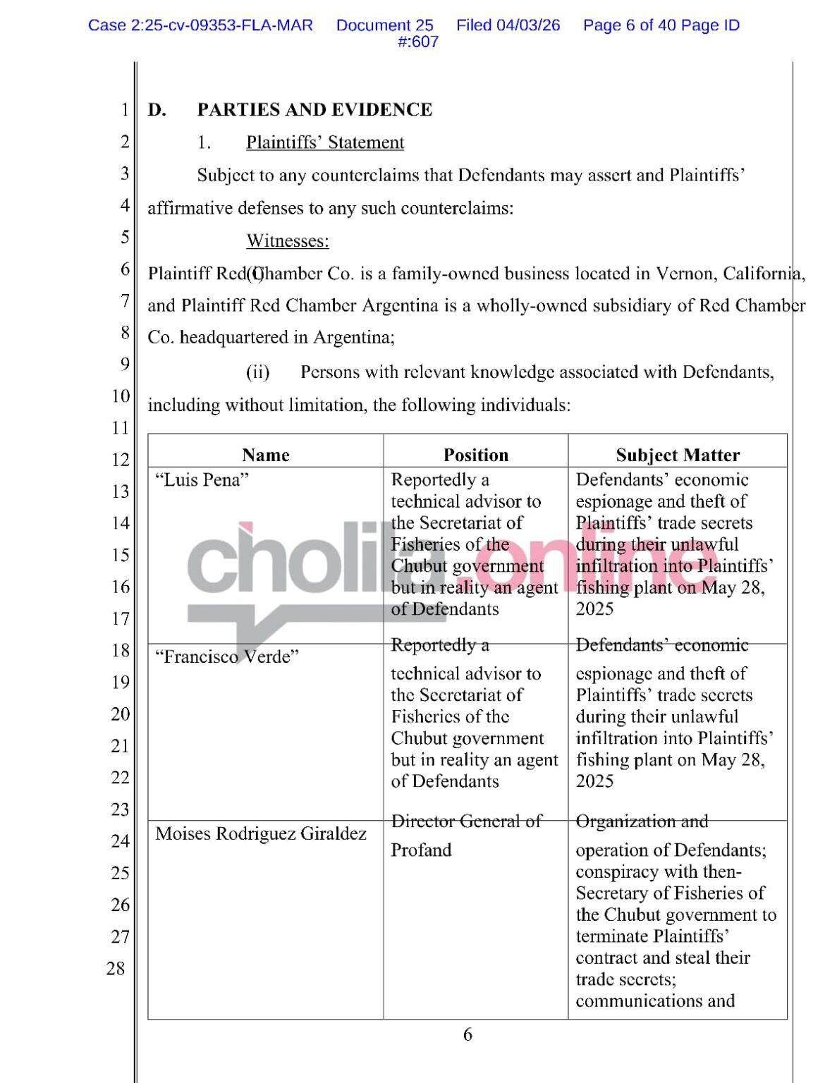 La justicia estadounidense no solo pone el foco en los mandos medios. La demanda incluye entre las personas con conocimiento relevante de estos hechos a la propia Oficina del Gobernador, mencionando explícitamente a Ignacio Torres en relación con las decisiones oficiales, comunicaciones y órdenes que derivaron en la terminación del contrato con Red Chamber para beneficiar supuestamente a Profand y Pesquera Deseado.