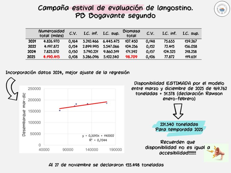 La Comisión de Análisis y Seguimiento de la Pesquería de Langostino (Pleoticus muelleri) recibió un informe de los investigadores del Programa Pesquería de Langostino del INIDEP donde se hicieron mención a los resultados de la campaña estival de evaluación. Mostraron que la estimación de biomasa y la numerosidad se encontraban dentro de los valores de la serie histórica reciente, con una estructura poblacional típica de la época y un aumento en el porcentaje de hembras en proceso reproductivo.
