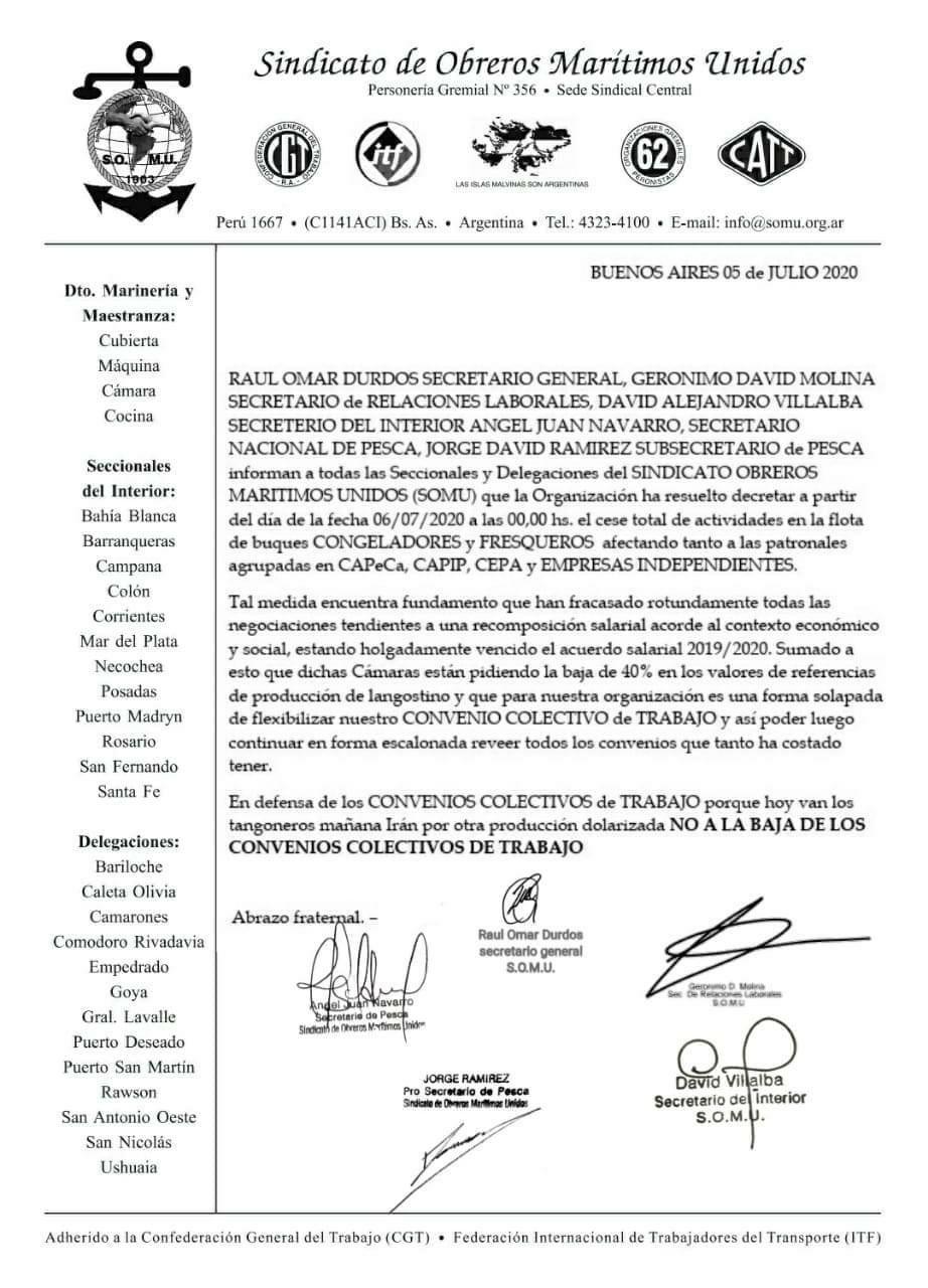 “La organización ha resuelto decretar a partir de las cero del 6 de julio el cese total de actividades en la flota de buques congeladores y fresqueros, afectando tanto a las patronales agrupadas en Capeca, Capip, Cepa y empresas independientes”, informaron.