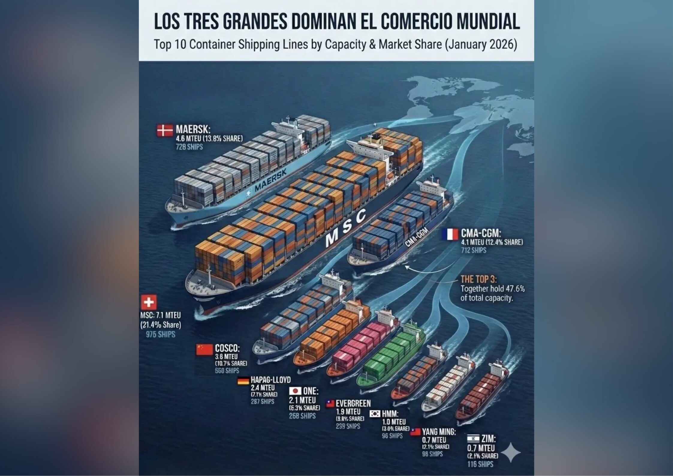 Al inicio de 2026, la industria del transporte marítimo de contenedores exhibe una concentración sin precedentes. Según los datos operativos de enero, las 10 principales navieras del mundo dominan el comercio global, pero es el «Top 3» el que marca el ritmo de la economía mundial, controlando un 47.6% de la cuota de mercado total.