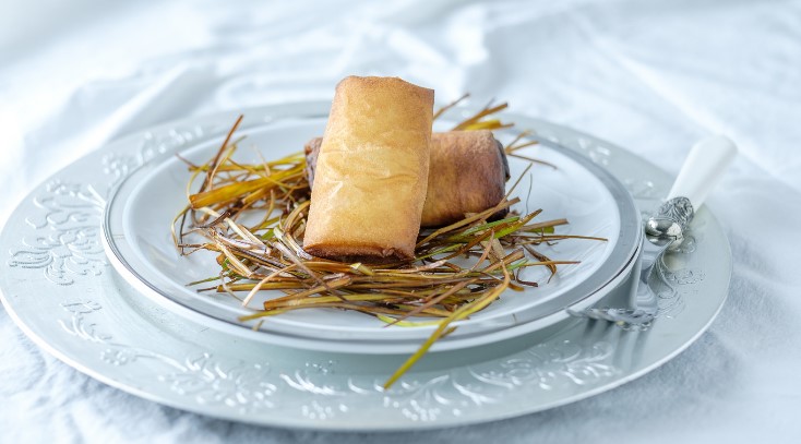 Colocamos una cama de puerro crujiente y encima el rollito en platos individuales.
