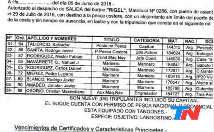 Las identidades de los nueve tripulantes que viajaban a bordo del pesquero Rigel, que zarpó el último martes de Mar del Plata y envió esta madrugada una señal de socorro cuando estaba a la altura de Rawson, constan en el despacho general de salida del buque emitido por la Agencia Marítima Smiriglio.