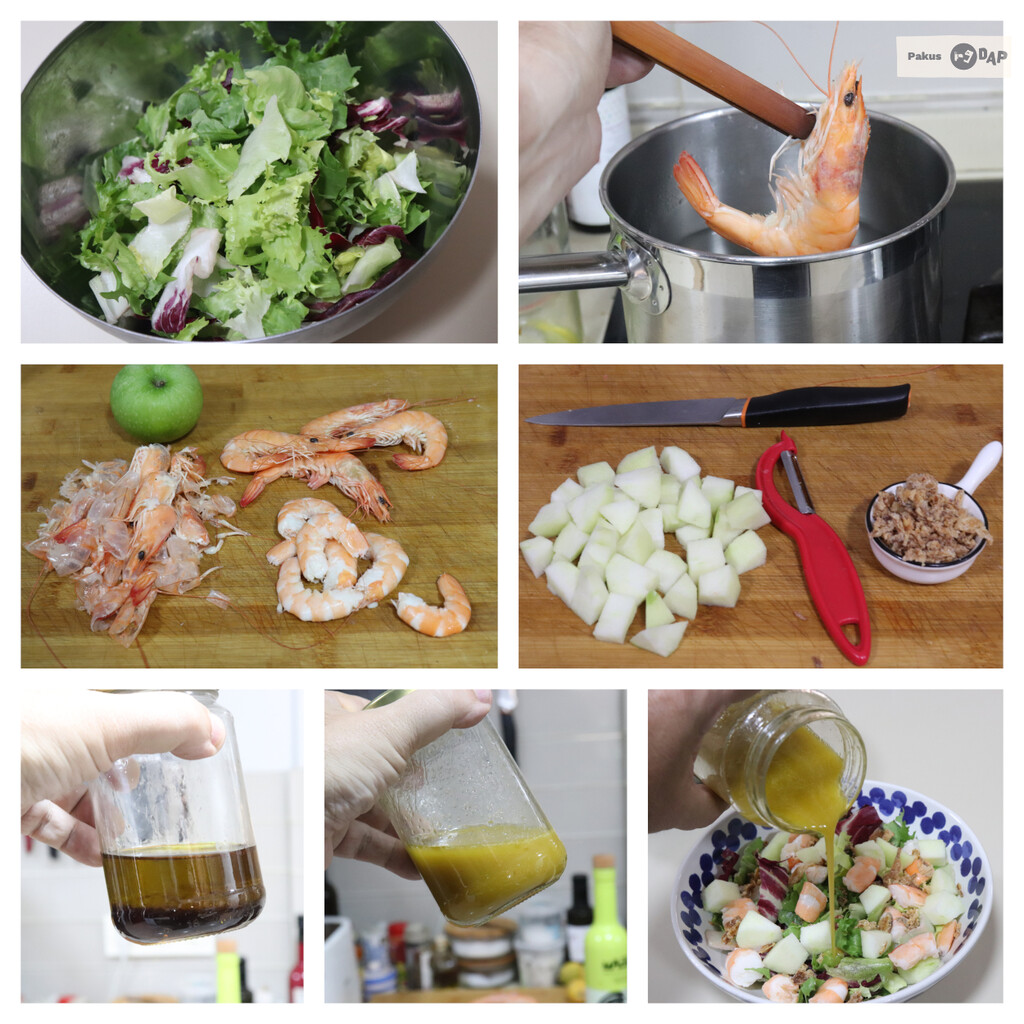 Además de lechugas variadas y langostinos, hemos añadido trocitos de manzana verde ácida y cebolla frita crujiente, para conseguir además de un sabor muy variado, diferentes texturas que nos hagan disfrutar de este plato, tenedorada a tenedorada.