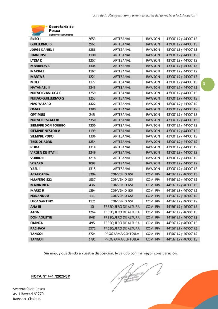 Arbeletche notificó al prefecto Principal Mauro Sebastián Sainz, Jefe de le Prefectura Puerto Rawson, “el listado de buques autorizados a operar a partir de las 00:00 horas del día 15 de noviembre del corriente año, en aguas jurisdiccionales de la Provincia del Chubut, conforme Resolución N° 687/2025-SP de Apertura Pesquería de Langostino para periodo 2025-2026”, especifica el funcionario.